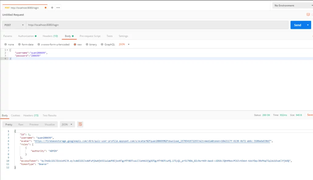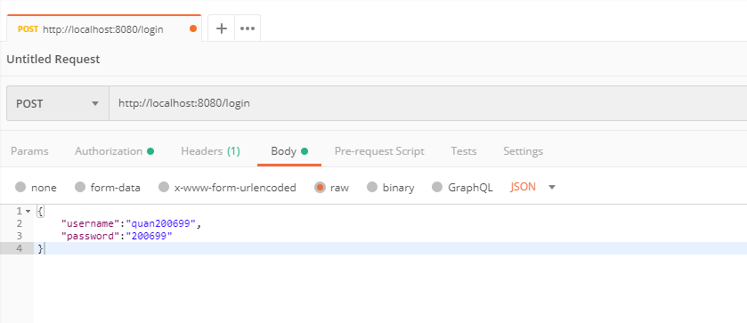 - Khi ứng dụng được chạy chúng ta bật postman lên rồi gửi request tới địa chỉ http://localhost:8080/login