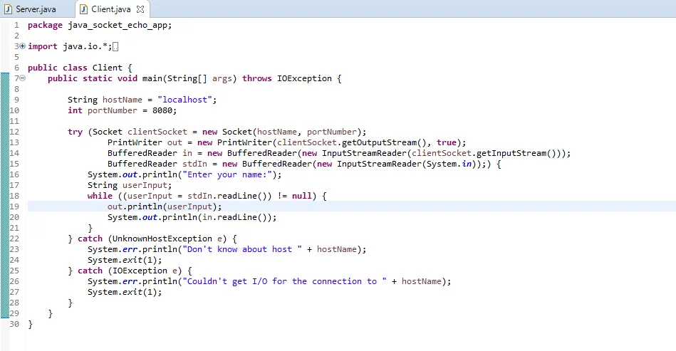 Dữ liệu gửi từ client sẽ được lấy từ luồng vào thông qua phương thức readLine() của BufferedReader được tạo trên đó. Sau khi xử lý, dữ liệu tiếp tục được ghi vào luồng ra của socket trên server thông qua phương thức println() của PrintWriter để trả về phía Client.