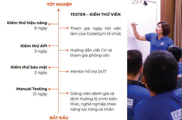 Kiến thức của khóa học Tester tại CodeGym được xây dựng theo lộ trình bài bản cho người mới bắt đầu, chắp những bước đi đầu tiên cho sự nghiệp của học viên. Đặc biệt hơn, từ khi bắt đầu đăng ký đến quá trình theo học, tốt nghiệp, học viên sẽ được đội ngũ chuyên gia dày dặn kinh nghiệm tham gia đánh giá và định hướng lộ trình kiến thức, nghề nghiệp theo năng lực từng cá nhân.