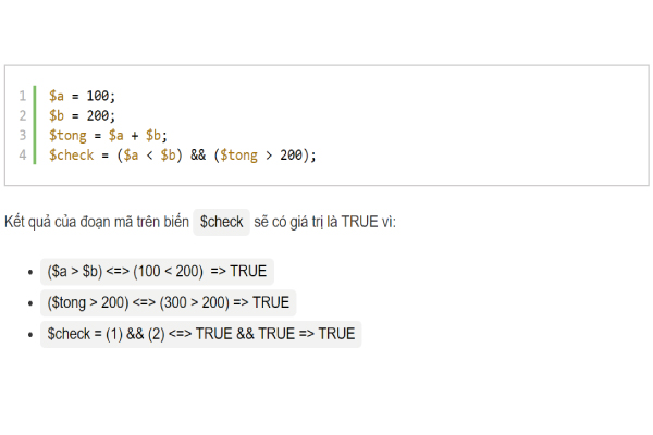 Lưu ý: Tất cả các toán tử luận lý có 2 ký tự trở lên đều phải ghi liền không được có khoảng trắng. Ví dụ
