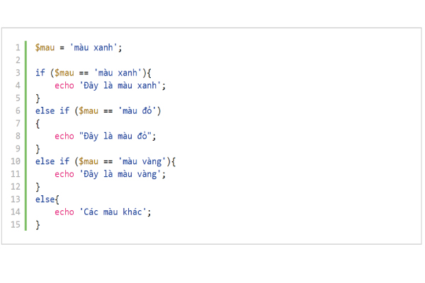 Giả sử ta nhập biến $mau = ‘màu nâu’ thì như thế nào? Tương tự trình biên dịch sẽ phải kiểm tra lần lược các màu xanh, đỏ, vàng đều không đúng, ở cái else cuối cùng là trường hợp còn lại của các trường hợp trên nên nó không cần kiểm tra và chạy thẳng vào luôn nên màn hình sẽ in ra dòng chữ “Các màu khác”.