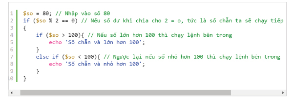 Ví dụ: Kiểm tra sô nhập vào có phải là số chẵn hay không?. Nếu nó là số chẵn thì kiểm tra tiếp số đó có lớn hơn 100 hay không. Nếu lớn hơn 100 thì xuất ra màn hình “Số chẵn và lớn hơn 100″. Ngược lại xuất ra màn hình “Số chẵn và nhỏ hơn 100″.