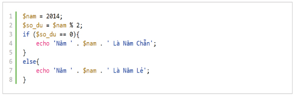 3: Kiểm tra xem $so_du == 0 hay không?. Số dư bằng 0 nên thõa mãn điều kiện vì vậy nó chạy vào biểu thức trong khối if. và xuất ra màn hình “Năm 2014 Là Năm Chẵn”. Nó sẽ không đoạn code ở bên trong câu lệnh else.