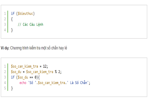 Chạy chương trình này kết quả sẽ xuất ra là “Số 12 Là Số Chẵn”. Nếu bây giờ giả sử ta đổi giá trị 12 thành 13 thì kết quả sẽ không xuất ra màn hình vì số 13 chia cho 2 sẽ dư = 1 và điều kiện để xuất ra câu thông báo là số dư phải bằng 0. => không đúng điều kiện thì trình biên dịch sẽ không chạy vào đoạn code bên trong lệnh if.