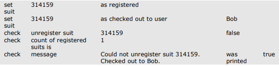 “Vậy, thử xem phần kiểm thử chấp thuận của UnRegisterCheckedOutSuit. Tao cá là nó sẽ cố hủy đăng ký một bộ đồ đã đã được xuất ra và đảm bảo việc hủy đăng ký thất bại.”