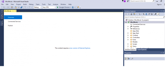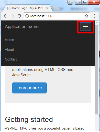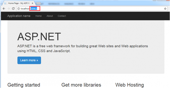 Bạn nhấn phím F5. Visual Studio sẽ khởi động IIS Express Web Server để chạy ứng dụng Web. Visual Studio sau đó sẽ khởi chạy trình duyệt và mở trang chủ của ứng dụng. Thanh địa chỉ của trình duyệt sẽ có dạng: “http://localhost:port#/”. Đó là vì localhost luôn trỏ tới máy tính cục bộ của bạn. Khi Visual Studio chạy một dự án WEB, một cổng ngẫu nhiên sẽ được sử dụng cho máy chủ WEB. Khi chạy ứng dụng chúng ta sẽ thấy những cổng khác nhau. Trong hình dưới đây, số cổng là “50061”: