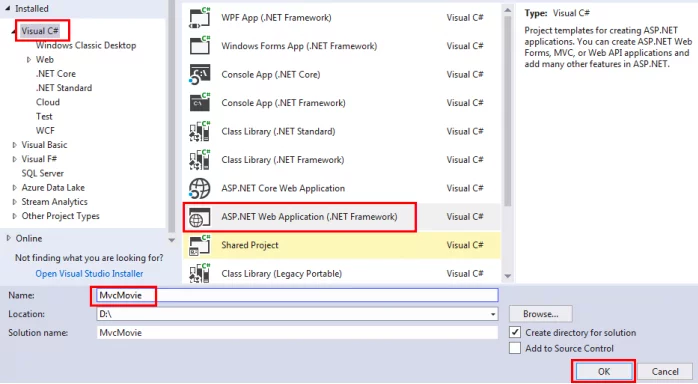 Sau đó chọn “Visual C#” tại danh sách bên trái, chọn “ASP.NET Web Application (.NET Framework)”. Đặt tên cho Project là “MvcMovie” và chọn đường dẫn lưu Project, sau đó nhấn “OK”:
