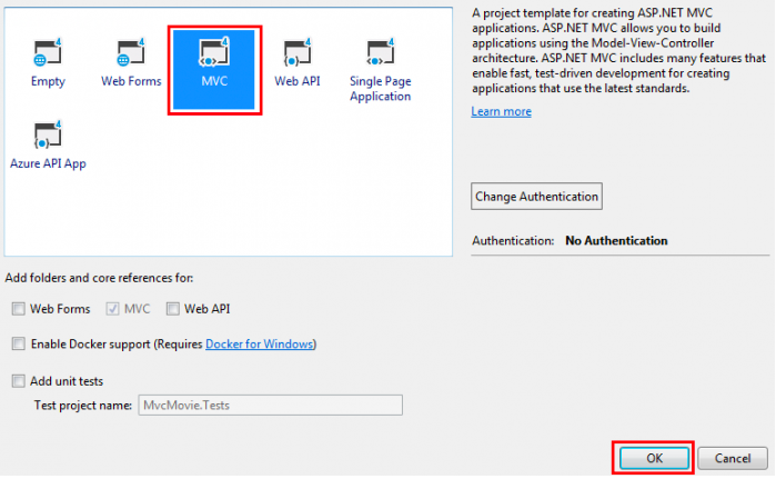 Tại màn hình “New ASP.NET Web Application”, chọn “MVC” và nhấn “OK”: