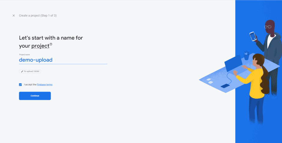 Bước 2: Điền tên dự án, sau đó chọn tiếp tục, cuối cùng, chọn tài khoản mặc định rồi chọn ‘tạo dự án’