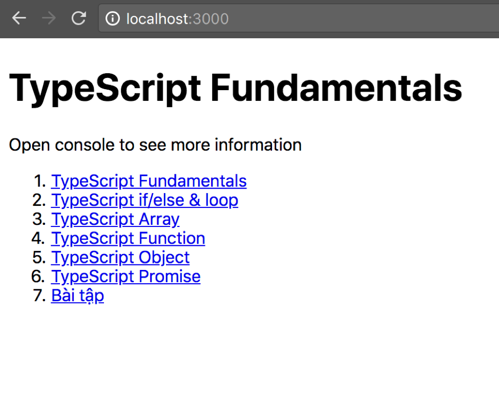 Bước 4: Chạy lệnh npm start, sau đó trình duyệt sẽ tự động mở trang web localhost:3000, các bạn có thể nhìn thấy danh mục bài học như sau: