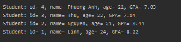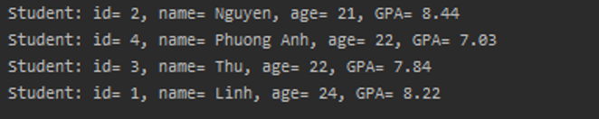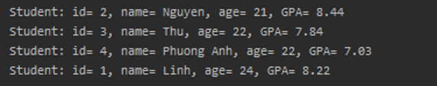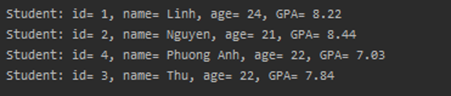 Với phương thức compareTo() được override như trên, trong trường hợp tiêu chí Tuổi của các đối tượng là bằng nhau thì compareTo() sẽ chuyển sang so sánh về tiêu chí ID theo giá trị giảm dần. Khi chạy chương trình ta có kết quả: