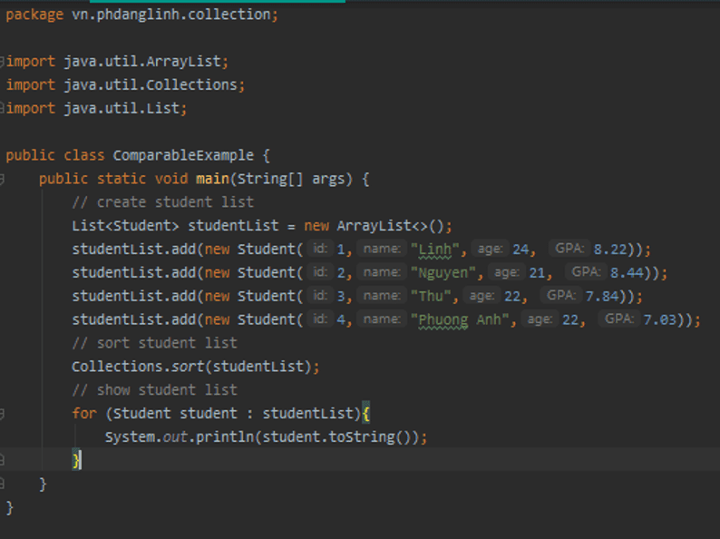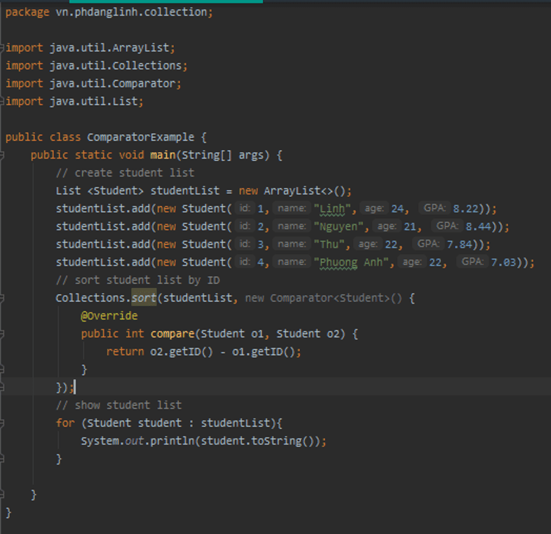 VD: Với Class Student ở trên nhưng lần này ta không cần phải implement interface Comparator: