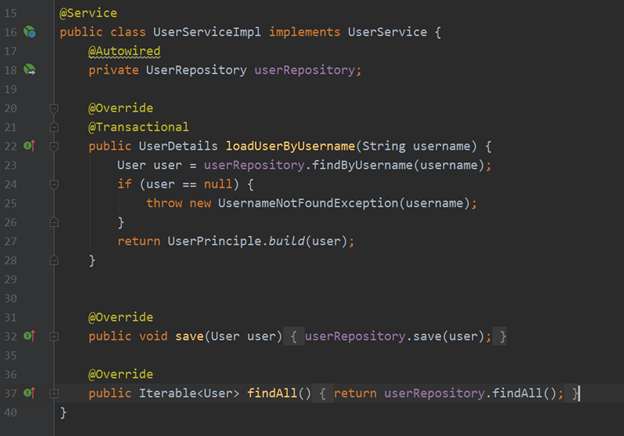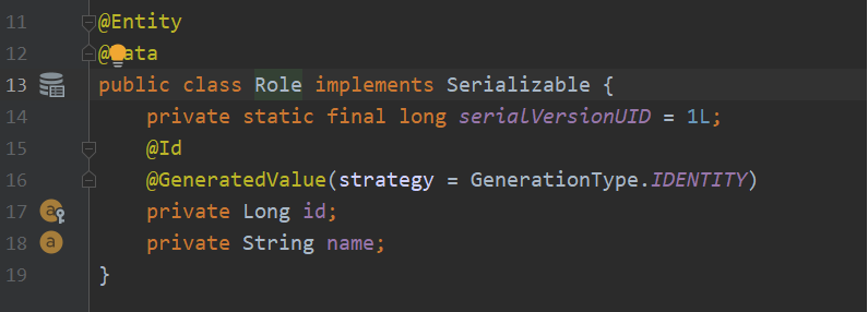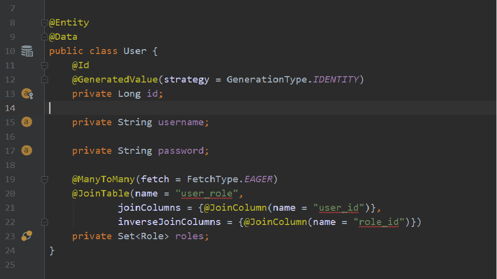 - Đầu tiên chúng ta sẽ tạo ra class User, Role và UserPrinciple ở đây mình sử dụng Lombok với @Data để tự tạo get, set