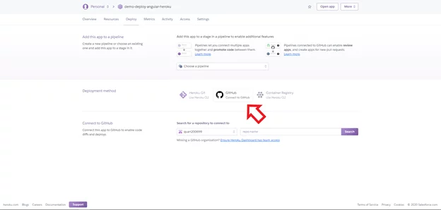 Sau khi đã kết nối github của mình với heroku thì các bạn tìm kiếm tên dự án vừa tạo ở github và tích chọn enable automatic deploy để tự động deploy ứng dụng mỗi khi up dự án mình lên github.