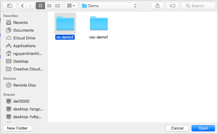 Bạn có thể mở một dự án đã tồn tại bằng cách chọn File -> Open -> Chọn Folder -> Open: