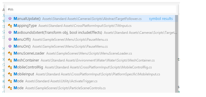 Nhấn ⌘T, bắt đầu nhập và xem danh sách các ký hiệu C # phù hợp. Chọn một và bạn sẽ được đưa thẳng đến vị trí mã của nó: