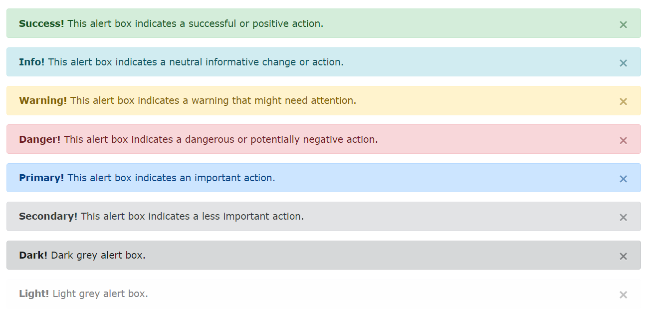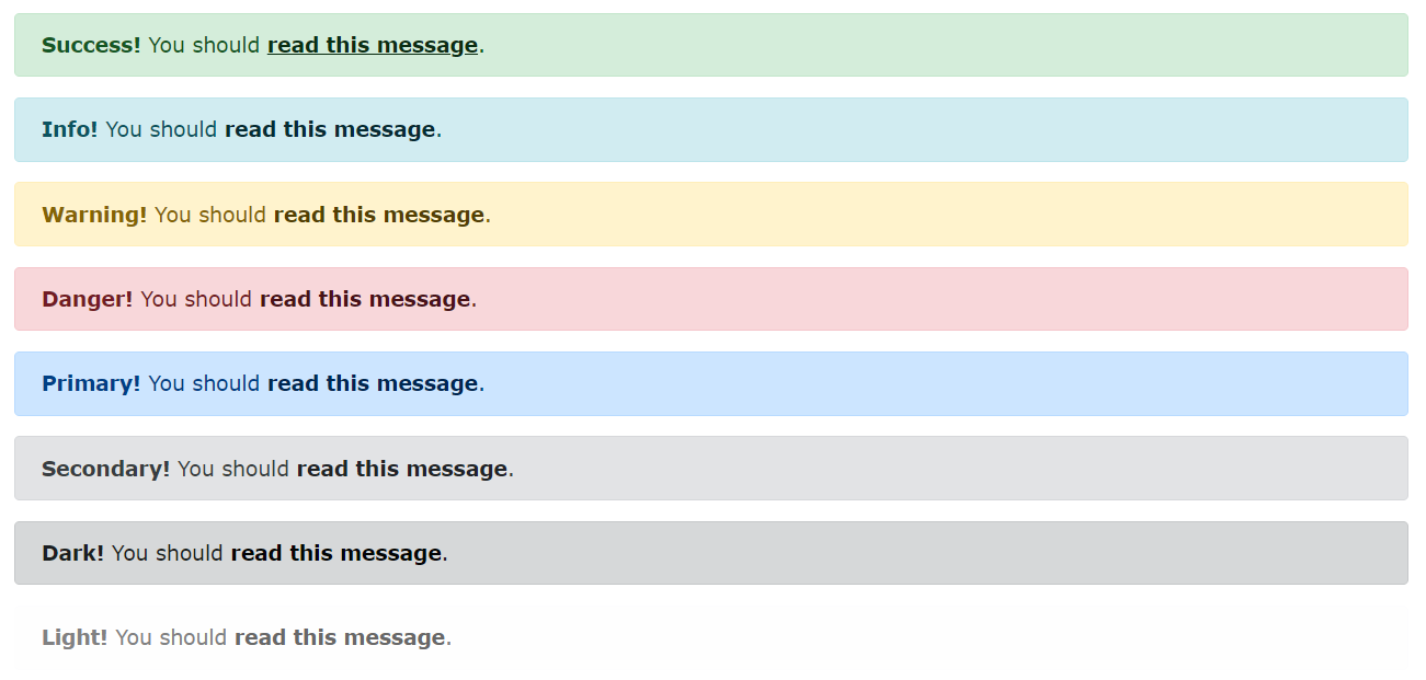 Cảnh báo được tạo bằng lớp .alert theo sau là lớp ngữ cảnh: .alert-success, .alert-info, .alert-warning, .alert-danger, .alert-primary, .alert-secondary, .alert-light và .alert-dark.