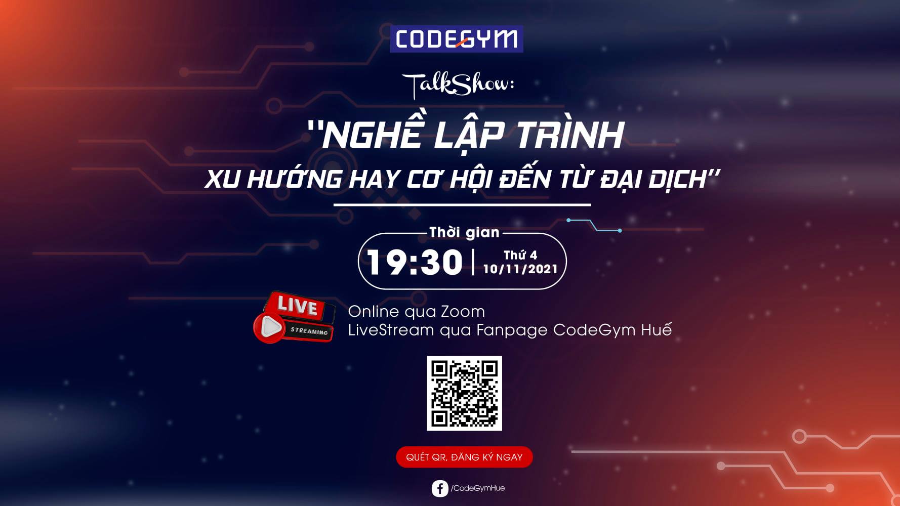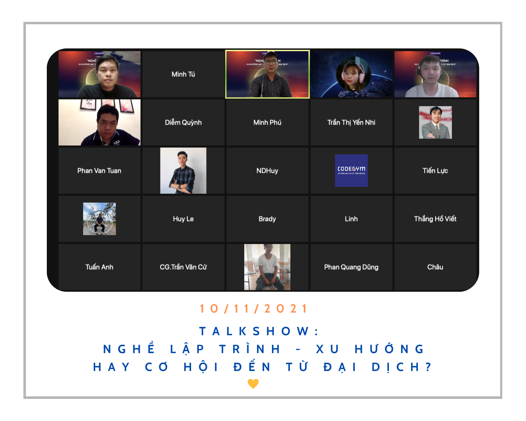 Vào ngày 10/11/2021 vừa qua, CodeGym Huế đã tổ chức thành công sự kiện Talkshow online với chủ đề “Nghề lập trình – Xu hướng hay cơ hội đến tự đại dịch”: