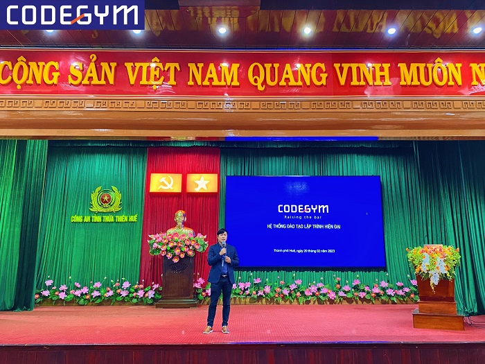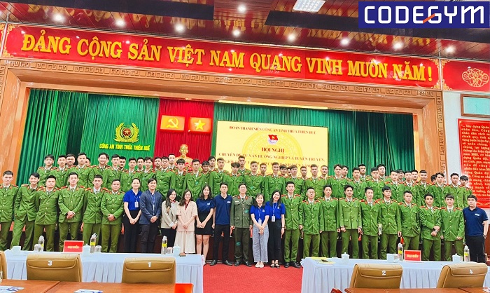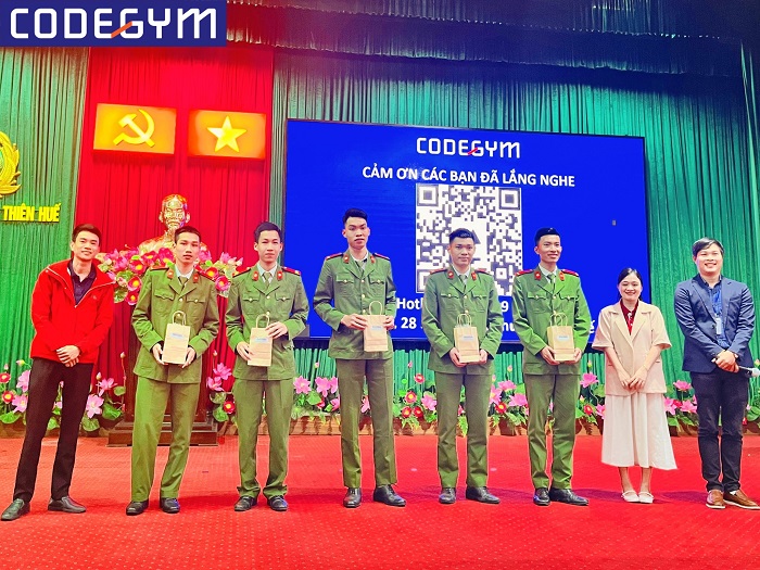 Để kịp thời định hướng và giới thiệu cơ hội tìm kiếm việc làm cho công dân sau khi hoàn thành nghĩa vụ Công an nhân dân trở về địa phương, tại hội nghị, CodeGym Huế đã chia sẻ về tương lai cũng như nhu cầu tuyển dụng của ngành nghề lập trình của các doanh nghiệp tại Huế và trong cả nước hiện nay.