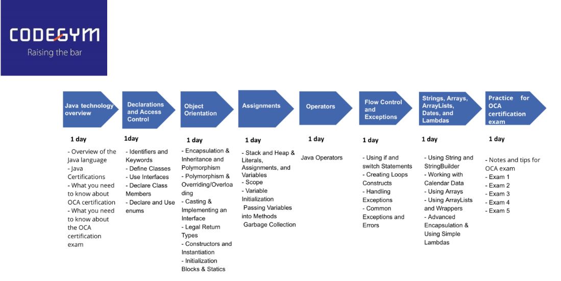 Chứng chỉ OCA là bước đầu tiên trong chuỗi các chứng chỉ Oracle Java Certifies gồm 4 cấp độ: Associate, Professional, Certified Expert và Master. Đây là chuỗi chứng chỉ chứng minh cho sự nắm vững kiến thức một cách toàn diện theo tiêu chuẩn nghành công nghiệp của công nghệ Java, bao gồm core Java, Java SE, Java EE…