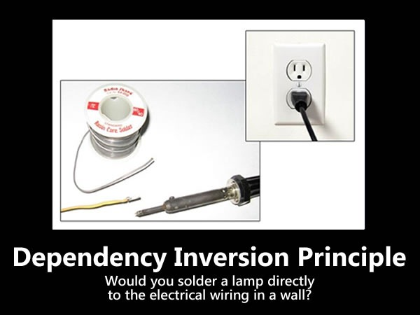 Các bạn hãy tưởng tượng code của chúng ta là cái đèn, và trong code của chúng ta có một đoạn dây cắm để cắm vào ổ điện giúp đèn hoạt động. Khi các bạn hard-code, nghĩa là các bạn đang hàn thẳng dây cắm vào ổ điện, làm cho đèn không rút ra được. Ổ cắm, dây điện, và bóng đèn của bạn trở thành một khối thống nhất. Do vậy, để sửa được đèn, các bạn phải tắt cầu trì, ngắt nguồn điện, tháo tung ổ điện ra, tháo tung bóng đèn ra, vân vân và mây mây… Nói chung là để sửa được đèn các bạn phải làm 3.14 bước rất loằng ngoằng so với việc code ra một cái phích cắm để có thể rút đèn ra khỏi ổ điện khi cần.