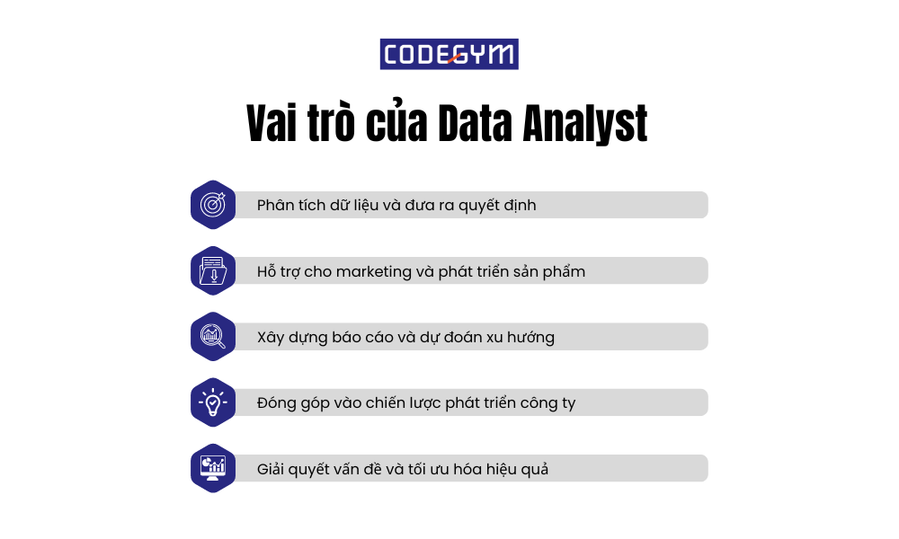 - Với vai trò là người dịch dữ liệu thành thông tin chiến lược, Data Analyst góp phần quan trọng vào việc xác định các mục tiêu chiến lược và đảm bảo rằng các hoạt động của công ty luôn hướng tới những mục tiêu này.