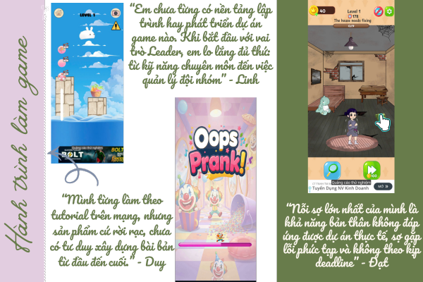 Trước khi bước chân vào kỳ thực tập, mỗi người đều có một xuất phát điểm khác nhau. Nếu như Hoàng Duy và Tiến Đạt đã có nền tảng lập trình cơ bản và từng “vọc” Unity theo tutorial, thì Linh lại hoàn toàn là một tờ giấy trắng với mảng game.