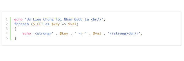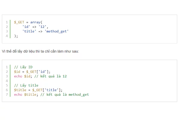 Tất cả các dữ liệu mà Client gửi lên bằng phương thức GET. Đều được lưu lại trong một biến toàn cục mà PHP tự tạo ra đó là biến $_GET. Biến này là kiểu mảng kết hợp lưu trữ danh sách dữ liệu từ client gửi lên theo quy luật key => value. Ví dụ với URL freetuts.net?id=12&title=method_get dữ liệu sẽ được lưu trong biến $_GET dưới dạng: