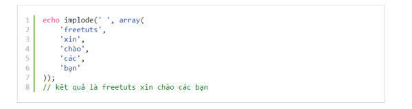 Hàm này ngược với hàm explode. Nó chuyển một mảng $piecesarray thành chuỗi và mỗi phần tử cách nhau bởi chuỗi $delimiter.