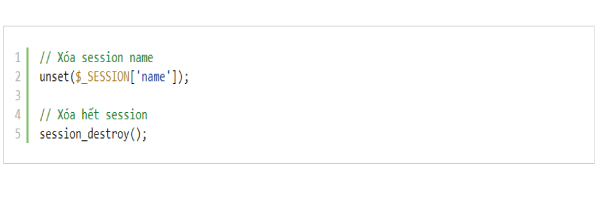 Tất cả giá trị Session đều lưu trữ trong biến $_SESSION.Vì vậy để xóa nó các bạn chỉ việc dùng hàm unset($_SESSION['session_name']). Trong đó hàm unset được dùng để giải phóng một biến ra khỏi bộ nhớ.