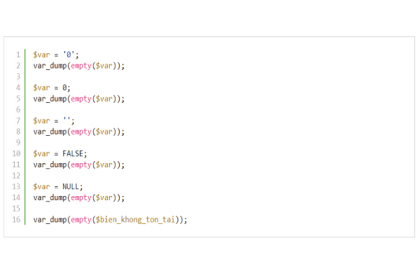 Ở trong ví dụ thứ 6 biến $bien_khong_ton_tai chưa được khởi tạo nhưng vẫn không bị lỗi. và khi sử dụng nó trong hàm empty() thì sẽ trả về TRUE.