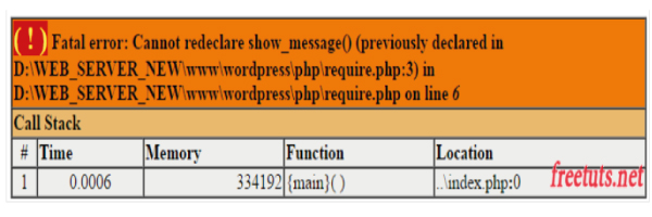 Nếu các bạn cứ cố ý require hai lần cùng một file thì lập tức sẽ bị thông báo lỗi vì hàm show_message() đã được định nghĩa. Lý do chính là khi ta require hai lần thì lần thứ hai đã bị đụng tên hàm. Bây giờ bạn thay đổi nội dung file index.php như sau: