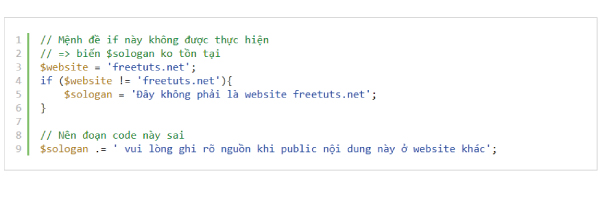 Rõ ràng nếu đoạn code này chạy sẽ bị lỗi ngay bởi vì biến $sologan sẽ không tồn tại. Vì bên trong câu lệnh mệnh đề if không được chạy.