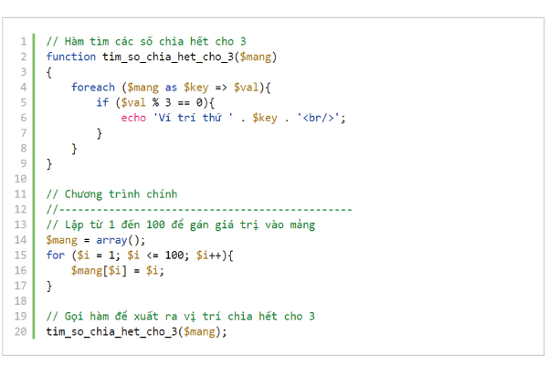 Ví dụ 2: Cho một mảng gồm các phần tử từ 1 đến 100. Hãy tìm vị trí các số chia hết cho 3 trong dãy.