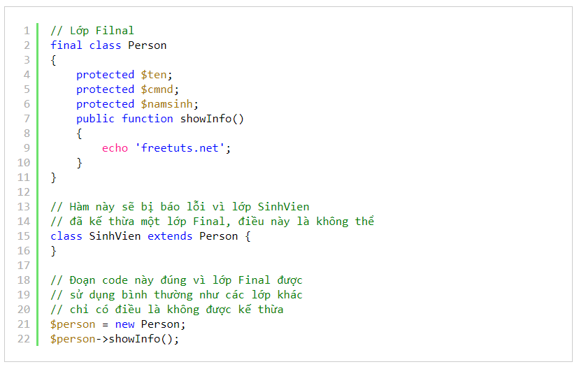 Lớp Final là lớp được khai báo là lớp cuối cùng, không một lớp nào có thể kế thừa nó. Tương tự như hàm Final trong Abstract hoặc trong kế thừa chỉ để gọi sử dụng, không được viết lại (Override). Các bạn xem ví dụ sau đây và thông qua phần ghi chú tôi đã giải thích.