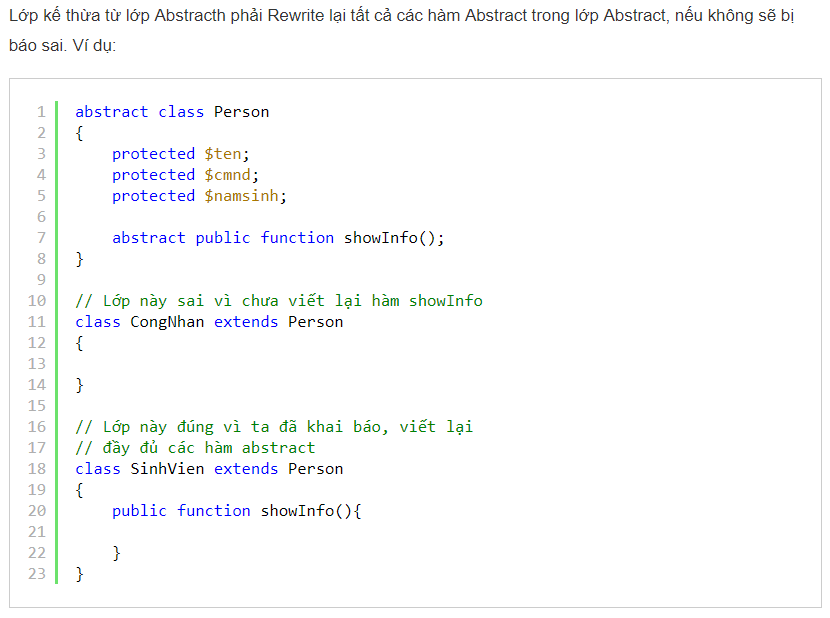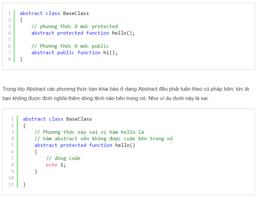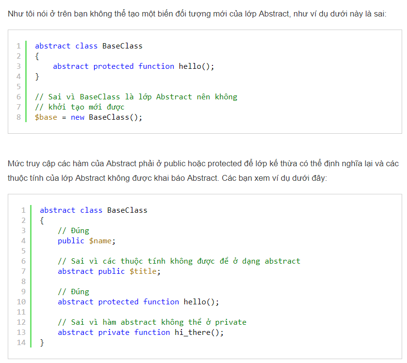 Lớp Abstract sẽ định nghĩa các hàm (phương thức) mà từ đó các lớp con sẽ kế thừa nó và Overwrite lại (tính đa hình). Tất cả các phương thức của lớp abstract đều phải được khai báo là abstract và phải ở mức protected và public, không được ở mức private. Lớp Abstract có thể có thuộc tính nhưng thuộc tính không được khai báo là abstract và bạn không thể khởi tạo một biến của lớp Abstract được.