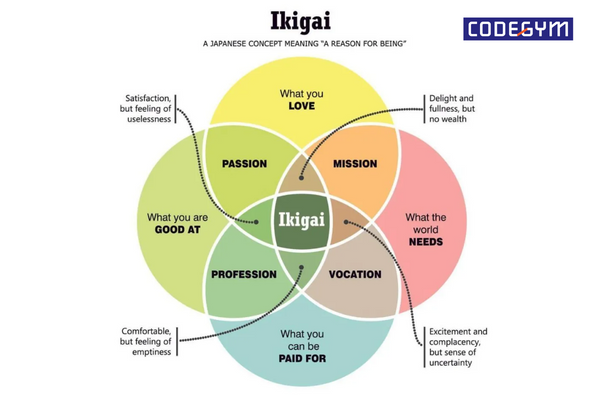 Ikigai có nguồn gốc từ Nhật Bản, đây là một triết lí không chỉ giúp bạn tìm ra được công việc phù hợp mà còn tìm ra mục đích sống để bạn cố gắng hơn từng ngày vì nó. Ikigai là giao điểm của 4 vòng: Điều bạn thích, Điều thế giới cần, Điều bạn được trả tiền và Điều bạn giỏi.