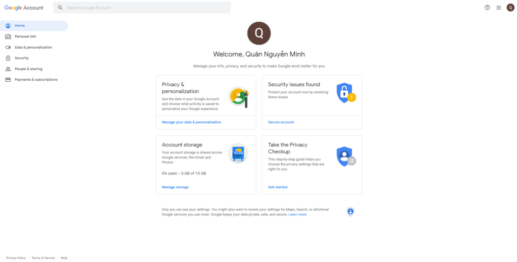- Sau đó các bạn truy cập đường dẫn sau: https://myaccount.google.com và chọn security