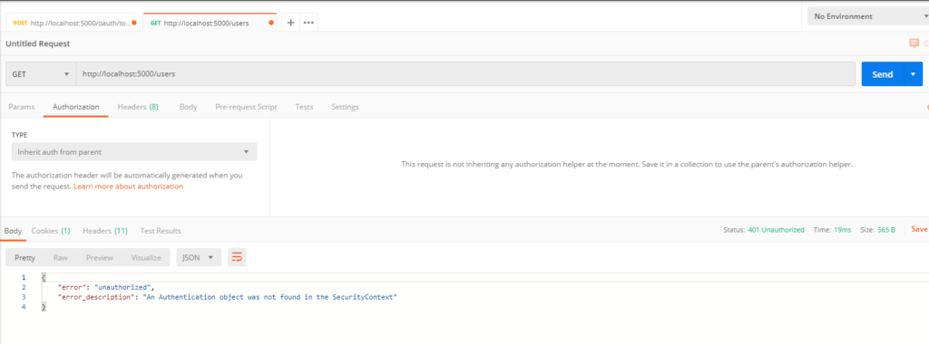 +) Và như trong hình hệ thống báo về lỗi unauthorized cho ta vì thế để giải quyết vấn đề đó chúng ta truy cập đến đường dẫn http://localhost:5000/oauth/token (vì ở đây mình dùng cổng 5000 nên sẽ truy cập đến localhost5000) để tạo ra access token và chọn type là basic auth