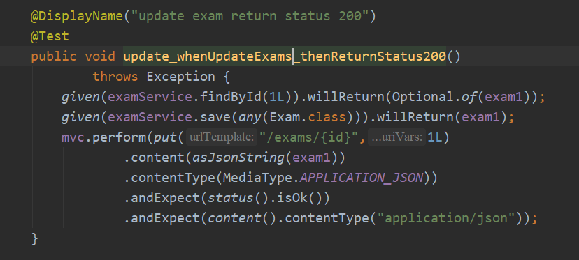 Để test phương thức update thì ta cần gọi đến 2 phương thức findById và save của ExamService thông qua given(…).willReturn(), khi phương thức findById được gọi sẽ tạo ra một mock Object là exam1 và sử dụng phương thức save để lưu lại mock Object này vì vậy để test update ta cần phải gửi request gồm có id và exam1 dạng Json và respone trả về phải là trạng thái 200 và exam1 dạng Json sau khi update.