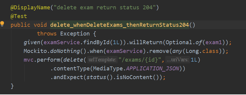 Tương tự như phương thức update ta vẫn sử dụng given() cho phương thức findById để tạo mock Object exam1 khi tìm kiếm theo exam có id là 1. Nhưng ở đây chúng ta cần sử dụng phương thức tĩnh doNothing() của Mockito thay vì dung given() cho phương thức remove() vì với phương thức doNothing() thì hàm remove() vẫn sẽ được gọi nhưng nó sẽ không làm gì cả, không làm ảnh hưởng đến các bộ test trong class.