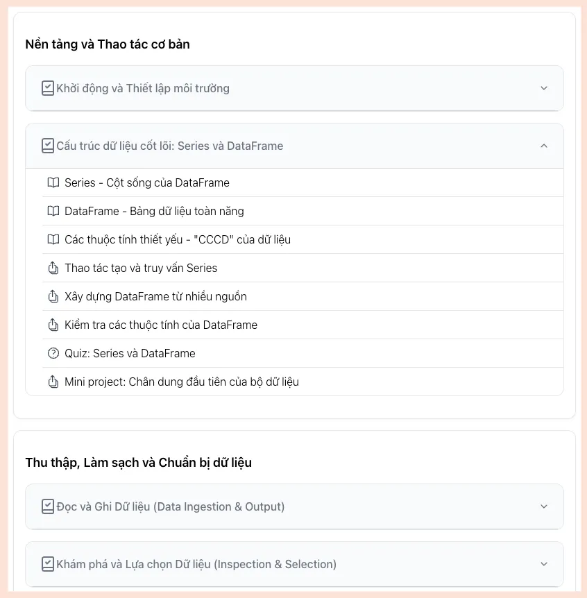• Nội dung chuyên sâu, thực tế: Chúng tôi sẽ dẫn dắt bạn từ những kiến thức nền tảng vững chắc về Pandas đến các kỹ thuật xử lý dữ liệu nâng cao, bao gồm: