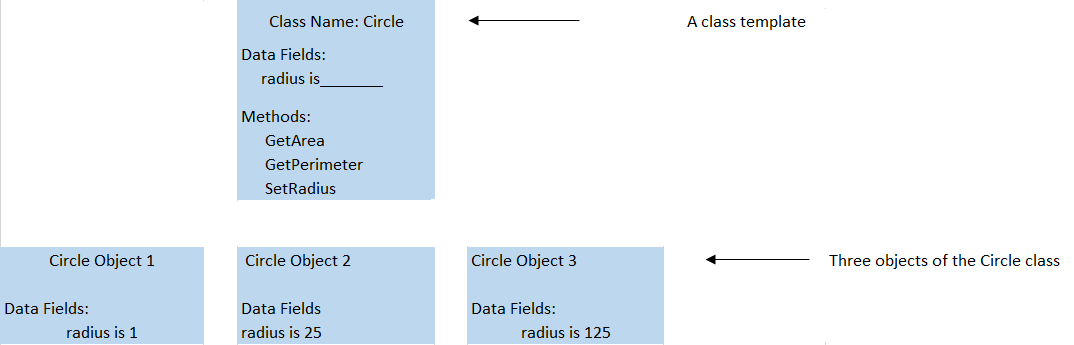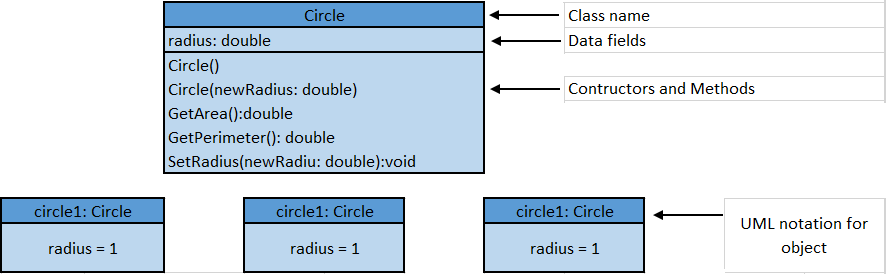 Các đối tượng thuộc cùng một loại được định nghĩa bằng một lớp chung. Mỗi lớp là một khuôn mẫu, blue-print hoặc contract mà xác định các trường dữ liệu và phương thức của đối tượng. Đối tượng là thể hiện của lớp. Bạn có thể tạo nhiều thể hiện (instance) của lớp. Tạo một thể hiện được gọi là instantiation. Thuật ngữ đối tượng (object) và thể hiện (instance) thường có thể hoán đổi cho nhau. Mối quan hệ giữa lớp và đối tượng tương tự như giữa công thức làm bánh táo và bánh táo: Bạn có thể làm nhiều bánh táo bạn muốn từ một công thức. Hình 1 cho thấy một lớp có tên là Circle và ba đối tượng của nó.