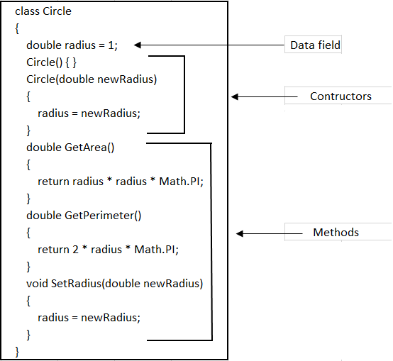 Một lớp C# sử dụng các biến để định nghĩa các trường dữ liệu và các phương thức để định nghĩa các hành động. Ngoài ra, một lớp cung cấp các phương thức đặc biệt, được gọi là constructor (phương thức khởi tạo), phương thức này được gọi để tạo một đối tượng mới. Một constructor có thể thực hiện bất kỳ hành động nào, nhưng constructor được thiết kế để thực hiện các hành động khởi tạo, chẳng hạn như khởi tạo các trường dữ liệu của đối tượng. Hình 2 cho thấy một ví dụ về định nghĩa lớp cho các đối tượng hình tròn.