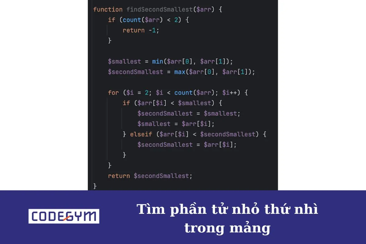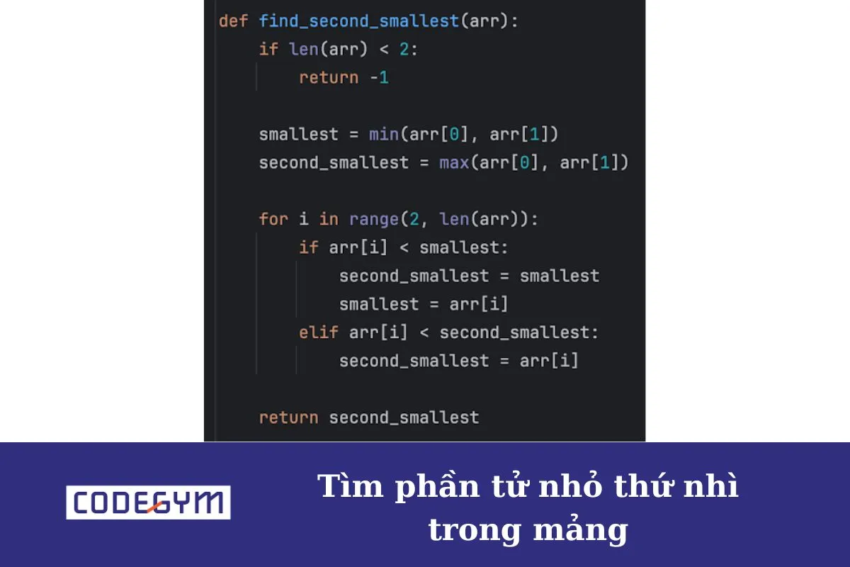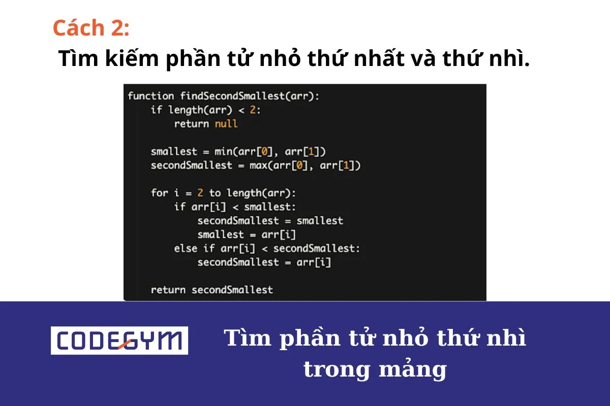 Ví dụ: Mảng [3, 6, 2, 7, 4, 5, 8, 4], phần tử nhỏ thứ nhì trong mảng là 3. Hãy tìm phần tử nhỏ thứ nhì trong mảng.