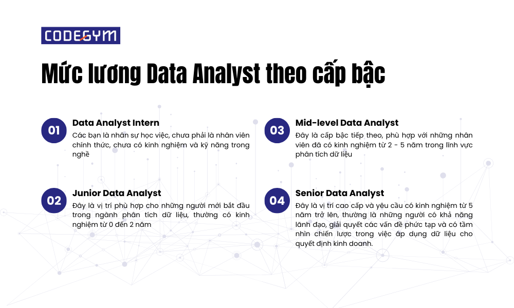 Trong ngành phân tích dữ liệu tại Việt Nam, mức lương của Data Analyst thường được phân chia theo các cấp bậc khác nhau, phụ thuộc vào kinh nghiệm và vai trò trong công việc. Dưới đây là chi tiết về mức lương theo từng cấp bậc chính:
