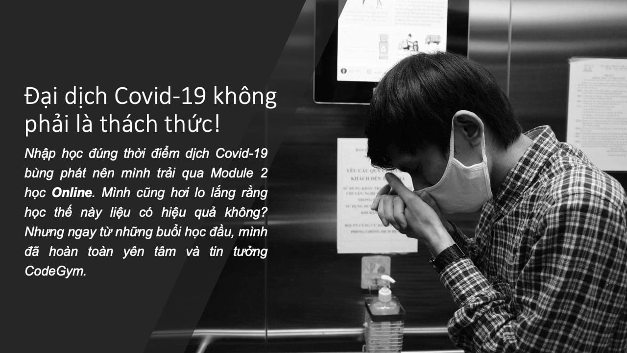 Thêm một điều đặc biệt là lớp mình nhập học đúng thời điểm dịch Covid-19 bùng phát (tháng 2, tháng 3/2020). Mình cũng các thành viên trong lớp trải qua Module 2 học Online. Mới đầu mình cũng hơi lo lắng rằng học thế này liệu có hiệu quả không? Nhưng ngay từ những buổi học đầu thì mình đã hoàn toàn yên tâm và tin tưởng. Học online chỉ là không tới lớp, còn lại mọi thứ từ chương trình, nền tảng học tập, cho đến sự hỗ trợ, sát sao của giảng viên vẫn không thay đổi. Thậm chí, các anh chị còn quan tâm và hỏi han nhiều hơn. Mình thấy CodeGym có thêm một điểm hay là mọi thứ đều sẵn sàng dù học bình thường hay Online.