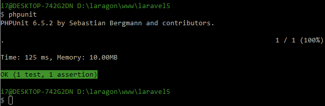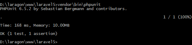 Bây giờ, hãy mở terminal của bạn và điều hướng đến thư mục gốc project của bạn, đó là thư mục của laravel5 đã đề cập ở trên trong bước 1 sau đó chạy phpunit đầu tiên bằng câu lệnh: “vendor\bin\phpunit”.