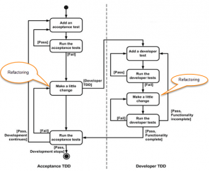 1. Mức chấp nhận (Acceptance TDD (ATDD)): với ATDD thì bạn viết một test chấp nhận đơn (single acceptance test) hoặc một đặc tả hành vi (behavioral specification) tùy theo cách gọi của bạn; mà test đó chỉ cần đủ cho các mã chường trình sản phẩm thực hiện (pass or fail) được test đó. Acceptance TDD còn được gọi là Behavior Driven Development (BDD).