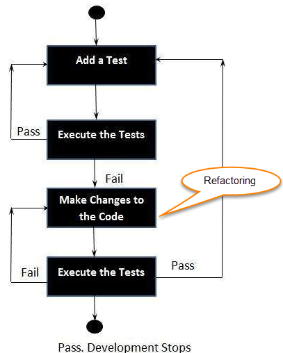 Trong quy trình Kiểm thử phần mềm thông thường, trước tiên chúng tôi tạo mã và sau đó kiểm tra. Các thử nghiệm có thể thất bại vì các thử nghiệm được phát triển ngay cả trước khi phát triển. Để vượt qua bài kiểm tra, nhóm phát triển phải phát triển và tái cấu trúc mã. Tái cấu trúc mã nguồn có nghĩa là thay đổi một số mã mà không ảnh hưởng đến hành vi của nó.